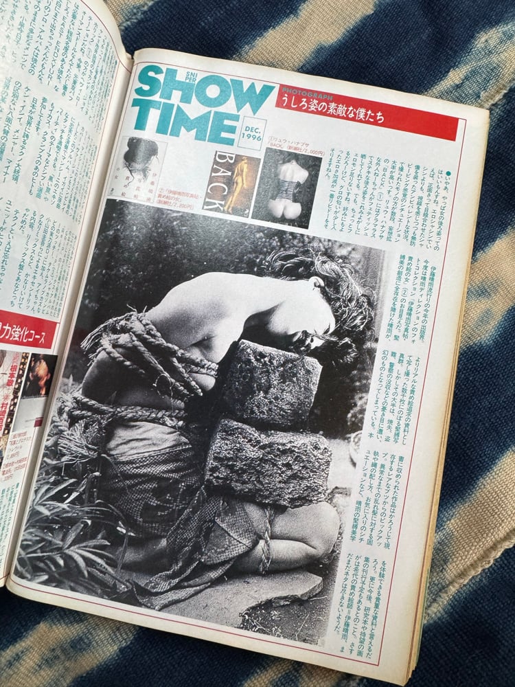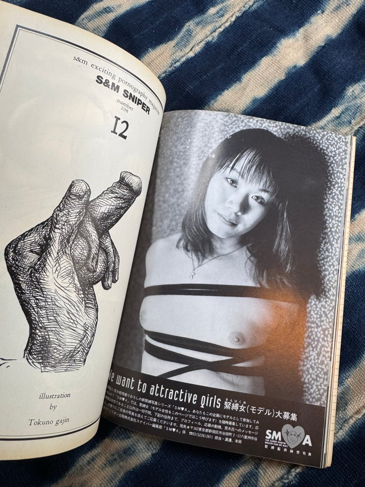 SM Sniper was a fetish and bondage magazine from Million Publishing that ran from 1979 to 2008. Unlike most other bondage mags coming out of Japan at that time, Sniper was less polished and much more gritty and artistic in tone. Virtually all of their covers were illustrated by Yosuke Onishi, and because of this, he's become a legend in his own right.